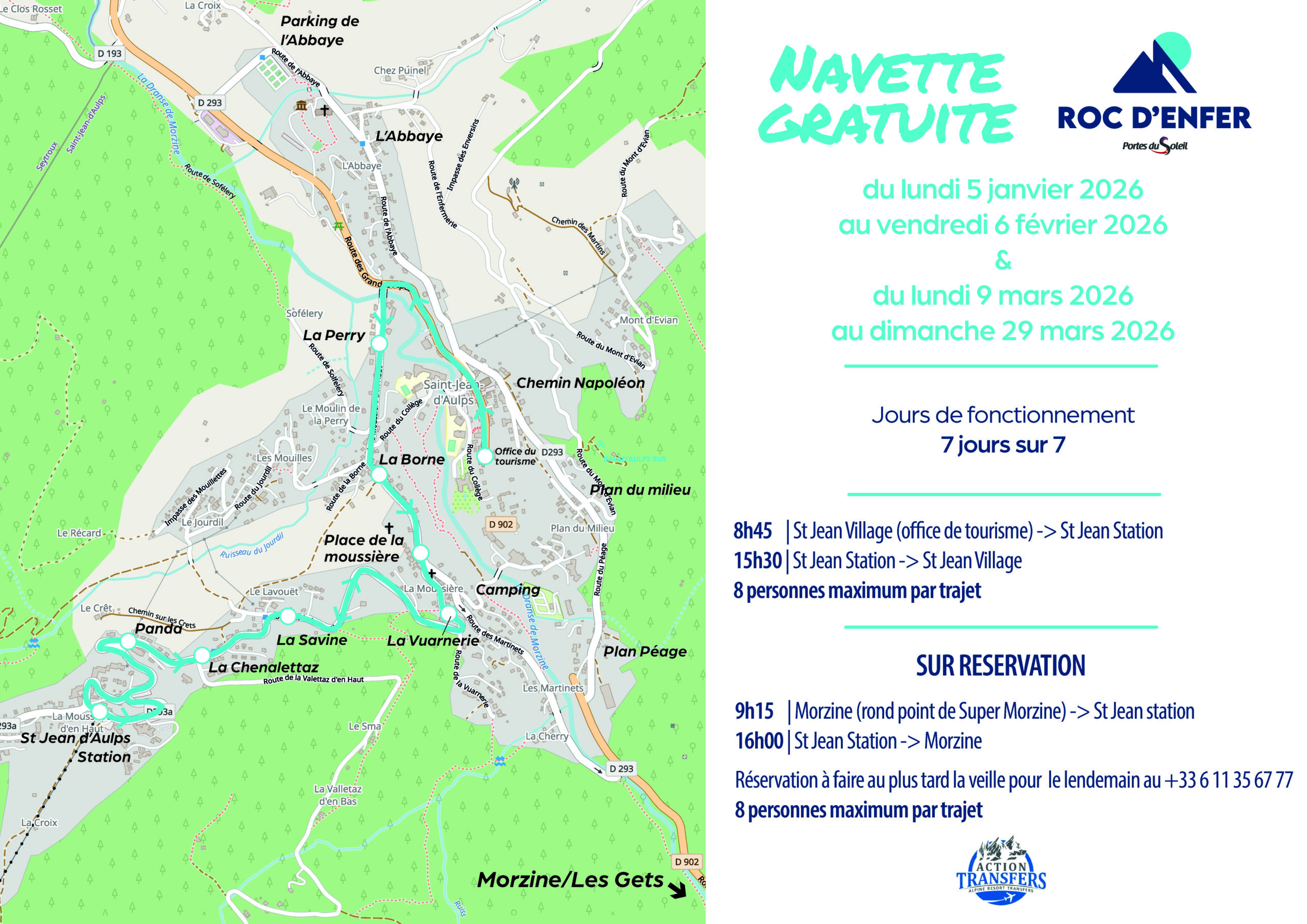 Du samedi 20 décembre 2025 au dimanche 4 janvier 2026 et du samedi 7 février 2026 au dimanche 8 mars 2026, une navette gratuite entre Saint Jean d’Aulps station – Saint Jean d’Aulps village est disponible tous les jours (y compris les dimanches et jours fériés).