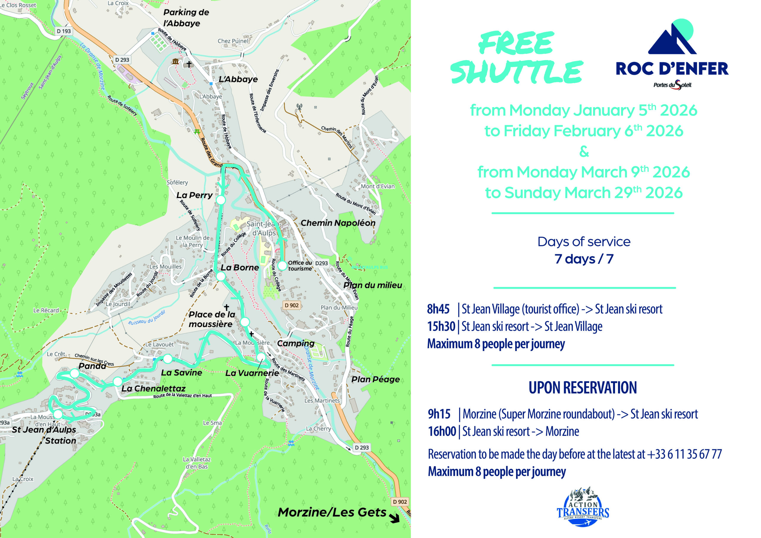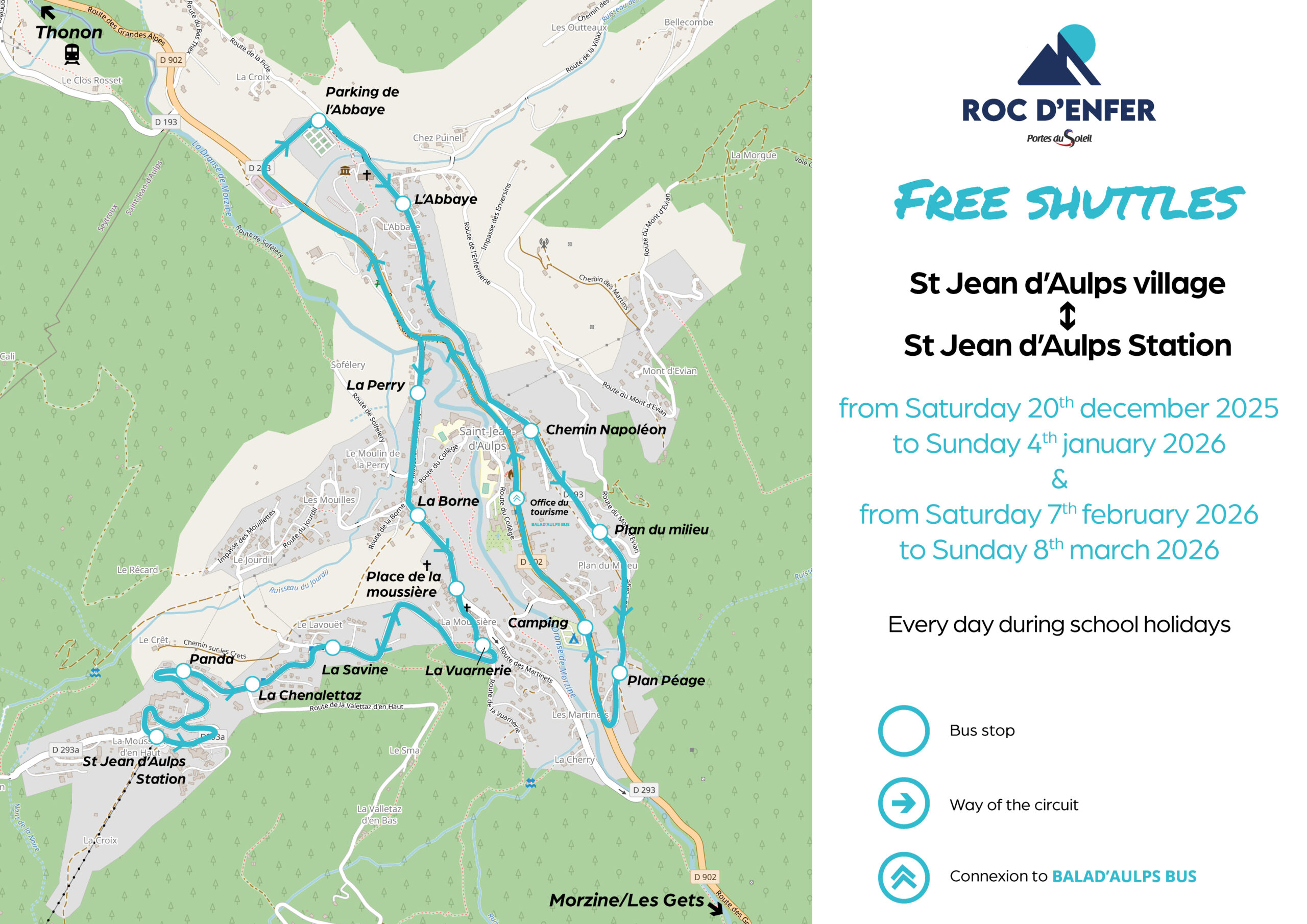 From Saturday December 20, 2025 to Sunday January 4, 2026 and from Saturday February 7 to Sunday March 8, 2026, a free shuttle between Saint Jean d’Aulps station – Saint Jean d’Aulps village is available every day (including Sundays and public holidays).